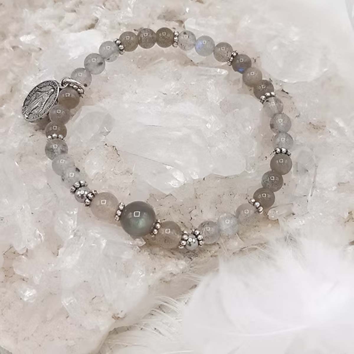 Le bijou est composé de perles de Labradorite de différents diamètres, associées à des rondelles métalliques argentées et à une médaille Sainte Marie.