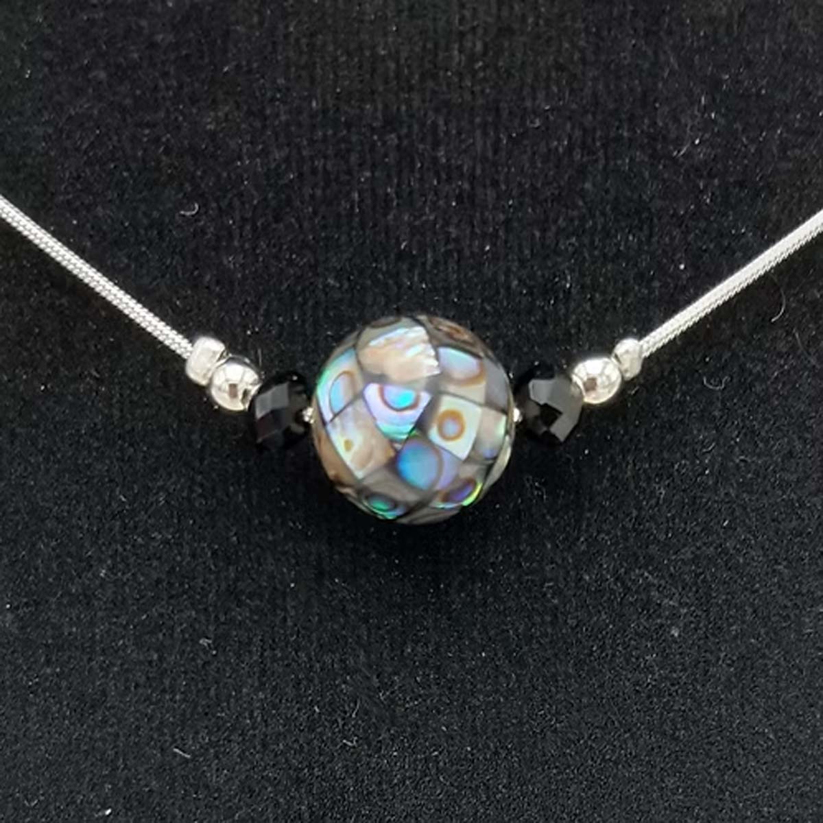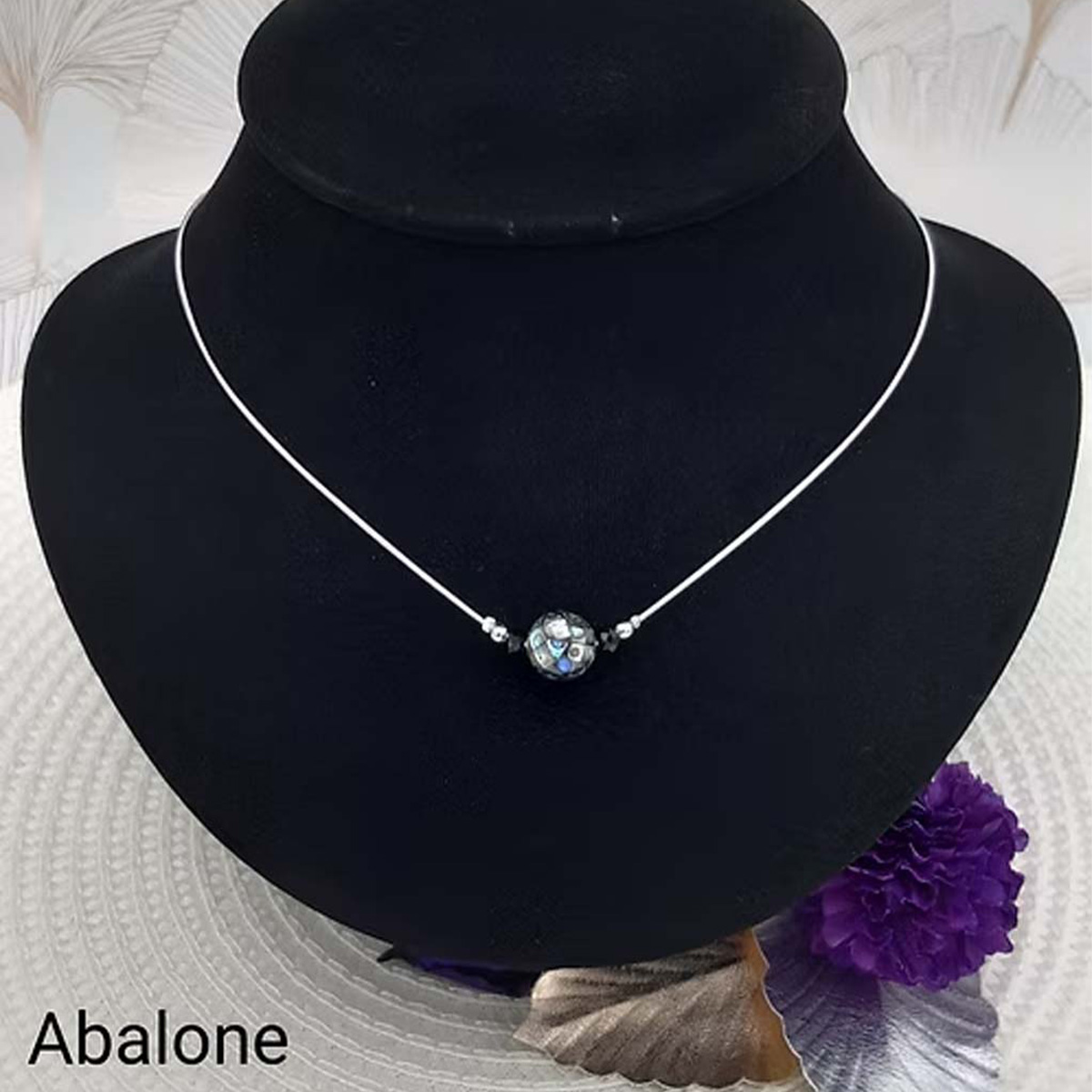 Le collier est agrémenté d’éléments décoratifs et d’une pierre naturelle d’Abalone, aux reflets irisés multicolores.